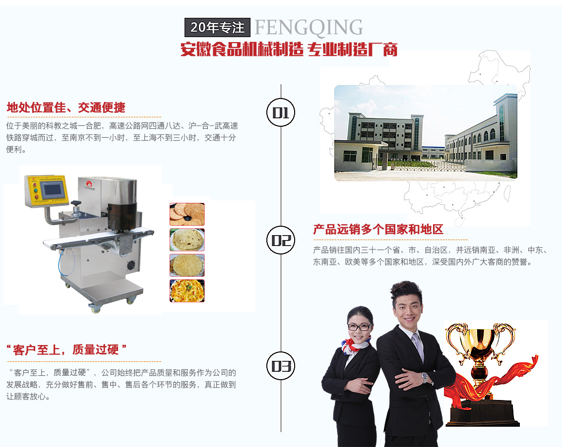 安徽豐慶食品機械制造有限公司位于美麗的科教之城—合肥,高速公路網四通八達、滬-合-武高速鐵路穿城而過,至南京不到一小時,至上海不到三小時,交通十分便利。   安徽豐慶食品機械制造有限公司是一家以面點、糕點、餅類等烘焙類食品機械的研發、生產、銷售為一體的現代化企業,產品集智能化,機電氣一體化為一身。公司匯聚一批具有豐富行業經驗的專業人才,高端項目與中國科學技術大學攜手合作,憑借先進的經營理念和技術優勢,不斷提升企業的技術水準和加工檔次,增強了企業的市場競爭力和綜合實力。過硬的產品質量和完善的售后服務使產品銷往國內三十一個省、市、自治區,并遠銷南亞、非洲、中東、東南亞、歐美等多個國家和地區,深受國內外廣大客商的贊譽。   公司秉承“誠信、團隊、服務”的經營理念,為客戶源源不斷地提供高新技術產品及優良的服務是豐...
